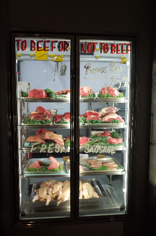 ラスベガスの繁華街から、ちょっと車で行った所に在るお肉屋さんドライエイジングもしているようです。得体の知れぬ?ソーセージや・・・ベーコンも作っています。こんなん焼いて食べたら旨いだろうな~~お客さんと店員さんが、相談しながら、肉を切り分けて、購入しています。肉のブティックみたいです。肉に対する文化が違うんですね。振り返ると、ウエイティングバーと、レストランに成ってる2階への階段が・・・ナイフが、これから肉を思う存分食うぞって言ってますこんなワイルドなナイフ、初めて見ましたピンボケですが、大きな椎茸のフライです。アボカドディップ付き。シーザーサラダおじさん達は、シェアして食べるから、ロメインレタスが切れているが、一人で食べるときは、ロメインレタスが長いまま出てくるみたいです。普通のレタスより、白菜みたいなロメインレタスの方が、本場のシーザーサラダって雰囲気ですね。でで~~んと来ました三人ですが、二皿で充分ですポテトと、大きなブラウンマッシュルームが付け合せ。色んなソースで食べられますが、塩だけでも、噛み締めて食べれば旨い。黒毛和牛のヒレと、牧草で育てた牛のニューヨークカットだったかな?とにかく、でかくて厚いです。男のステーキですサシなんて入っていませんよ。まさに赤身脂身の部分のスジが硬いけど、あとは、もぐもぐわしわし、歯が、赤身の筋繊維にミチミチと食い込んでいくのが快感だねくどくないから、一人一枚食べられたかもしれません。鮪の赤身を食べても思わんけど、牛肉をもりもり食べると、おじさんでも、今夜は頑張れるかもしれんって思えるよね