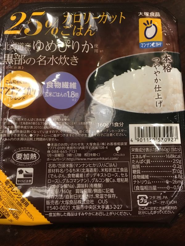 こんなご飯が、玄関から3分の所に在ったら、食べちゃうな🍚 カロリーが抑えられて、尚且つ、糖質量も、通常のご飯より少ないです。 普通、ご飯茶碗一杯150gで、糖質換算55g位なのに、これは40g弱。 おじさんは、半膳しか食べないから、20gの糖質です。 これなら、安心してご飯が食べられる👌🏻 ただ、レンジで3分ですが、部分的に、ベチャッとおじや状態だったり、変に米が長く見える辺りが、美味い飯とは言えませんね😅