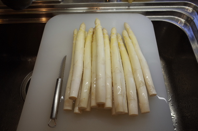 毎度の定番ネタですみません。この時期、北海道の滝本農場のホワイトアスパラは欠かせません。3L以上のふっといノってお願いしましたが、まだ、大きさが不ぞろいです。まあ、太いのがイイ日も有るけど、手ごろな太さの方が気持ちイイ時もあるからね。太さ神話に振り回されてはダメだよ、若者よ一本だけ、真ん中と根元を握って、ぎゅって曲げると痛いですが、自然とポキっと折れる場所が有ります。それで、大方の切り離す長さを決めて、残りは、包丁で根元を切り取ります。勿体無いけど、少し長めに切り取った方がスジが残らないあとは、ピーラーで、穂先の下のくびれたところから根元まで、皮をす~~~す~~~っとむいて、カスが残らないよう綺麗に洗いましょう根元と、ピーラーの剥きカスを、沸騰させます。沸騰したら、本体も入れて、硬めに温まって貰います。その間に、生のまま、マヨネーズを体にたっぷり塗りっこして、グリルで焼いてみますそら豆も、生のまま、さやを脱がして、皮も爪をたてて剥いちゃいます。で、天婦羅にして、青も、天婦羅。甘っちょろい青二才は、あっという間にのぼせ上がってとろとろに成ってしまいます。固ゆでしたホワイトは、バターたっぷりで焼いた目玉焼きと一緒にバターの風味が効いた、とろとろの熱々の黄身をまとったアスパラは、最高です