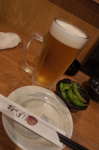 ヘイカケさん家が作った、おかげさま無事に取り付け完了!4月1日にオープンして、早、一月半経ちました。ちょっと偵察に・・・大繁盛なので、予約しないと入れないかもカウンターに一席だけ空いたので、運よく入れましたが、カウンターもテーブルも、小上りも超満員ビールを飲みながら、ヘイカケさんや禁玉減酒さんにメール席が空いてないのに、呼び出して大丈夫か?と思いつつ、なんとかなるだろうと勝手が判らないまま、限定赤身を注文周囲の注文を聞いていると、焼き鳥や、串揚げも人気のようです。大きなアジフライ、身が厚くて旨いです。ヘイカケさんの名前を出せば、話は早いと思うんですが、一見の客が入店してスグに、そういう話をするのは如何なもんかと、黙って飲みながら、席が空くか観察そら豆の天婦羅はだね。偶然にも、お隣の一人客が帰ったんで、即、お店の人に、「あと二、三人来ますから、この席、予約席にしてもらえますか?」とお願い。ヘイカケさんと、禁玉減酒さんなら、二席で三人座ればイイだろう自分がタバコを吸わないから、こういうお店のマッチって、久しぶりに見ましたが、マッチが有るくらいですから、禁煙のお店でも、分煙のお店でもありません焼酎のお湯割りを飲んでる内に、二人が来て、二席でベンチがけして酒盛りスタート。そうこうしてるうちに、後ろのテーブル席が空きそうなんで、即、キープ運がイイデスハンソンテーブル席に移動して、本格的飲む弐升半入った焼酎ですヘイカケさんがキープされている焼酎です。スケールがおいらの指です。 2升5合という、超ビッグなビンです。ますます繁盛、という語呂から、升+升+半升=2升5合=4.5リットル瓶です。 製造元は、千鶴、いも神、破壊王とか美味しい焼酎を作っている神酒造さん。この後、お湯割りとか、水割りでいただきましたが、この大きな瓶からグラスに注ぐのが一苦労。 気をつけないと、腰をやられます。・・・と禁玉減酒さんが言ってます店長さんです。ヘイカケさんの親父さんも、登場この人もココ、凄いデカい酎ハイが有ります。ビールの大ジョッキに、酎ハイを作ってくれます。他のお客さんが飲んでいるのを見て、思わず注文。おしっこ近くなるだろうな~~メニュウに親子丼が有ったんで、玉子ちゃん大王としては、見逃してはいけませんヘイカケさんが「このおじさん、玉子大好きだから、ウズラとか、いろいろ乗せてあげて。」と頼んでくれて出て来たのがコレ海苔が邪魔だねなんか卑猥に見えるしさいっただっきま~~す店長のお父さんも、手伝ってるそうです。家族でお店をやるってイイよな~~水曜日と土曜日が比較的空いてるそうですが、予約してから行った方が良いと思います。その際は、おじさんにも、ご一報ください