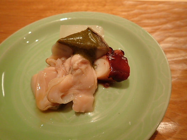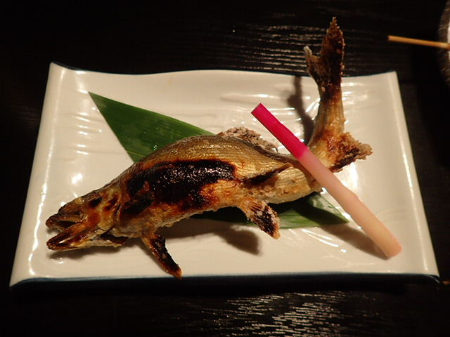 亀尾島川解禁二週目今回、大将でも手を焼いたそうです。これは、先週の釣果今週は、こんな可愛い鮎川の水が少なすぎて、小さな鮎が群がって泳いでたそうです皮の色が薄いし、金色の班が無いのも居る。先週は、初回から大きいな~と感心しました。背中が盛り上がってるもんね今回は、小ぶりというか、始まったばかりだから、これくらいでしょう。全部の中から、一番デカいのを選んでくれたおかげです。でなきゃ、大将の指くらいの太さの鮎です実際、お昼ご飯を食べに来たおばさま二人連れが、鮎を所望されましたが、夜の予約の分が精いっぱいで、大将が「まいったな~~~」と唸ってました細面な、スマートな鮎です。でも、焼き加減も良く、香り、味は文句なしですこの面構えがイイよねご馳走様でした、幸せですそして、赤身のお勉強今回は、鳥取、境港の本マグロ右側の部分を上から下へと希望左の赤身が、香り、酸味、渋み、柔らかさ、ともに凄い身をくねらす旨さです思わず、「旨い。」と口からこぼれます。普段、大将は、いちいち産地など言いません。おじさんが聞くから応えてるだけです。黙って、ポンっと置くだけです。左アオリイカ、右ケンサキおじさん、食べて、アオリイカとスミイカの区別はつくけど、他は判らん違うことは判っても、何イカか答えられん。ケンサキイカとヤリイカなんて、実物を見比べても判らんだろうな早くスミイカの新イカが出てこないかな~~長い事通っているけど、初めて食べる鯵の甘酢漬けしっかりした脂が有ればこその旨さですね。上品に成って、生より好きだね、おじさんさあ、また来週