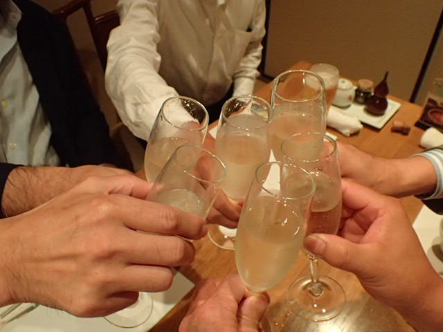 震災チャリティーに来てくれた「味感ことほぎ」のご夫婦と、右は久屋大通りのショコラトリータカスのタカスさん。日曜日、ご参加頂いたお礼に、勉強会の後、同業のSちゃんと「ことほぎ」さんへ。Sちゃんも、ことほぎさん、気に成っていたそうなんで、グッドタイミング蓮の葉に乗った、涼しげな一皿からスタートシャンパンをボトルでお願いしました。チャリティーご協力ありがとうございましたこの季節に、紅葉のお椀?と思いつつ蓋を開けたら・・・桜も咲いていました三河湾でも、こんな大きな雲丹が採れるんですね。おじさん、生のトリガイ苦手なんですエビと、蝦蛄の生は止めてねってお願いしたんですが、トリガイを言うのを忘れてました。モウカザメの心臓のお刺身震災チャリティーの時に、気仙沼から取り寄せたの食べて美味しかったんで、使ってくれてるそうです。チャリティーが、気仙沼と、ことほぎさんをつなぐことが出来て、凄く嬉しいです。生の魚介には日本酒だよね。シャンパンと日本酒のちゃんぽんに成った頃、なんと、腹ペコ歯医者さん夫妻とルパン君夫妻がやってきました何処から手を付けてイイか迷ってしまう楽しい八寸腹ペコさん達も、チャリティーに来てくれたお礼に、予約をされて来店したそうです。そういえば、禁玉減酒さんとスローライフmamaさんとしゅしゅしゅ~さんたちは、ふじ原さんに行ってくれたとか。この震災チャリティーって、みなさんの、お互いの思いやりが詰まってて素敵だな~~~って、自画自賛的に思えます。ヒレ肉も、和風にさっぱりと食べられて、年寄りには助かります 三河では赤むつと言いますが、今や、のど黒が全国区腹ペコさんからシャンパン、白ワイン、赤ワインとご相伴にあずかりスッカリ出来上がってしまったおじさんでしたこの後、お蕎麦と水菓子を食べたのに、撮り忘れことほぎさん、日曜日も営業してます。コストパフォーマンスもかなり良いです。何と言っても、若いお二人の接客が気持ち良いまた来ますね~~~
