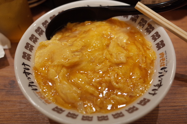 腹ペコ歯医者さんの大名古屋ビルヂィング完全踏破記、参考に成る人は多いでしょうねでも、おじさんは、混んでるところは嫌いだから、まだ、しばらく行くつもりは無かったんですが、『見た目よりあっさりしている完成度の高いラーメン』by 腹ぺこ歯医って、日記が有りました。ラーメン屋さんは、糖質制限おじさんとしては、どうでもイイんですが、その中の写真に、餃子と並んで、エッグライスの文字がなんだ?なんだエッグライス北京本店の北京飯に似てるような・・・玉子ちゃん大王としては、これは、行かねばなるまい、なりますまい白雪けたてて行手は名駅大名古屋ビルヂィングゥ~~~~午後一時半、拍子抜けするほど、空いてましたな~んだ券売機ですが、お姉さんが前で説明してくれますから困る事無く、肉が沢山乗ったラーメンと、エッグライスの券を迷うことなく購入。お姉さんに、ご飯も麺も少な目でお願いし、並ぶことなく即、カウンターへ。きっと、おじさんは、背油肉そばの肉がいっぱいを頼んだんだねラーメンと一緒に出てくると思っていたら、エッグライスが先に来ました。 肉肉肉肉って、丼から肉肉しいなとろとろ感が、やはり北京飯に似てます。油の匂いが、成れてないせいか、気に成る。卵だけかと思ったら、下にチャーシュウの切れ端が入っています。おじさんは、北京飯のジャンクさの虜だから、北京飯に軍配が上がるけど、350円ならコレ悪くないです凄いラーメンが来ました真っ黒で、工場の廃油ですか?って聞きたくなる生の刻み玉ねぎやカイワレが、口直し的なんでしょうが、背油とニンニクの匂いには、無駄な抵抗です。チャーシュウが八枚くらい入ってますから麺を包んで食べるんですが、おじさんには、チャーシュウもスープも醤油辛くて降参脂、平気だと思ってましたが、このバラチャーシュウの脂にも立ち向かえず・・・こんな状態で敗北ですおじさんには、とにかく醤油辛い全く食べられませんでも、周りの人達は、スープも飲み干してますから、個人差ですね。歳よりは、薄味がイイですハンソン初めての大名古屋ビルヂィング、一合目で遭難でした