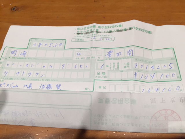 皆様からの義援金、いつものピースジャムさんに134100円、振り込みさせて頂きましたありがとうございました。義援金にご協力いただいた皆様1、カズキ2、ヒミカ3、藤井4、昭和35歳5、スローライフmama6、しゅしゅしゅ~7、たけし8、みほ+ルパン君9、味感 ことぼぎ 伊藤10、味感 ことほぎ 女将11、ふじ原12、腹ペコ歯医者13、かおり14、禁玉減酒15、ゴトウ16、キタガワ17、ほたる18、トシエ19、タイチ20、ケイ21、プッチ22、マサカズ23、アルブーコヨコイ24、コバヤシ25、Infinty‐m26、アンティママ27、さなぎCOM28、さなぎ妻29、三ツ谷30、三ツ谷妻31、幸子32、nkucchan33、スズケンS郷34、スズケン友35、タカス36、ほたる妻37、のむりえ次回は、9月4日に、同じココ、キッチュエビオさんのレンタルスタジオ『スタスタ』で午後2時より開催します。こんな言い方は、ご協力頂いた皆さんに失礼かもしれませんが、私たちは、財力の在る大企業のエライさんでも、人から称賛される才能あふれた人材でも、容姿で注目が集められる美男美女でもありません。何処にでも居る、ただの普通の人です。でも、被災された人たちの多くも、普通の人達です。だからこそ、お互いの気持ちが判りあえると思います。大げさな事はしたくありません。ご近所のおせっかいなおじさん、おばさんの気持ちで、「元気だしな。」って言い続けたいです。これからも、ご協力、よろしくお願いします。発起人一同 イノテカ、へいかけ、さなぎ、ころたん、nkucchan
