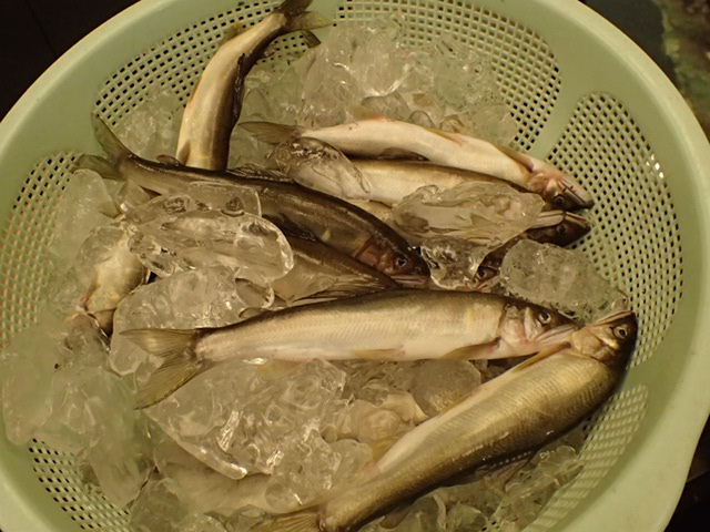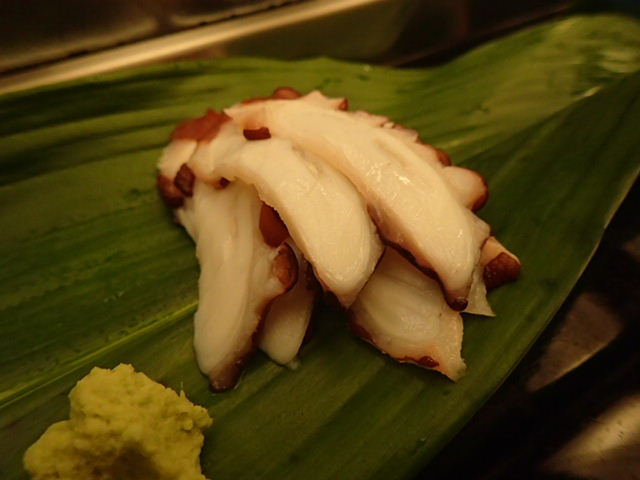 本当に、もう、皆さん、見なくてイイですから同じネタですから、書くことが有りません月曜日のお昼は、鮎の勉強です冷蔵庫に入って居ない、さっき湯がいて人肌に冷めたタコ。冷えていないから、香りが良いです。甲殻類の香りが、口元に持ってくるだけで、顔の周囲で漂います。ぶつ切りより、削ぎ切りの方が、表面積が広いから、香りも味も良く分かるし、ポリデントのお世話に成っている歯に優しい前半は、鮎が釣れなかったから、アマゴやサクラマスを釣っていたとの事。釣っていたって言われても、アマゴやサクラマスも釣れない人も居ただろうにそうそう箸の長さは24センチです。今回は20匹釣れなかったそうです。などと話をしてる内に・・・鮎のお出まししっとり清清しい身質が旨いんですよ。身がパサパサしてるなんて有り得ないワタがクリームのように滑らかでした。砂を食んでいないと、本当に美味しいです。ジャリっと口の中で、一粒でも砂が当たると、美味しいリズムに酔いしれていたのが、一瞬で冷めてしまう。だから、おじさんは、身を先に食べ始めます。身を食べている間は、気持ち良いリズムが壊れる心配が無いから今回も、六枚付のコハダのシンコおじさん、もう少しシンコが大きく成ったら、凄い食べ方を考えたんで実行しようと思ってます美しい雲丹が有りましたこれは、本当に熱々の卵焼き。丁度、焼きあがったばかりの卵焼きを若い衆が、奥から焼き器ごと持って来た。大将が、「アチっあつっ」と言いながら、切り分けてくれました甘い熱いデザートです大将が漬けた新生姜しゃくっ、しゃくっとした歯応えが楽しいお土産にしたい(言わないけど)もう、これが最後のトリガイだと思います。と、剥いたばかりのをさっと炙って握ってくれました。湯引きより、甘さが力強くてイイナ~~~はい、海苔巻き食べてご馳走様でした。この日、お隣に、ご夫婦がいらしてたんですが、なんと一人で三匹鮎食って、その後、握りを一人前と、別に数貫食べて帰られたそうですおじさん達より、確かにお若そうでしたが・・・おじさん達は、鮎二匹と、このお寿司たちで、もうお腹いっぱいでした羨ましいな~~~