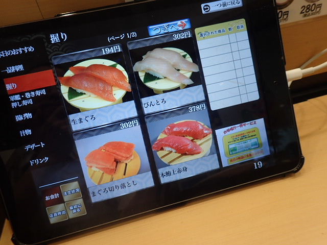 とうとう魚魚丸にもタッチパネルが導入されていたおじさん、変な所が潔癖症なんです。誰が触ったか判らんもんを、食事中に素手で触るなんて嫌だまして、その手で、寿司をつまむなんて、でけんどこぞのクソガキ様が、鼻くそほじった指で触っとるかもしれんあ~~やだやだほんでも、おじさんのまぐろ切り落としと、奥さんの本鮪上赤身を注文しました。小指の爪先で、ちょちょっとねもちろんコレもやっぱし、暑い日はプハ~~~~ッてビールに稚鮎の天婦羅。天婦羅の衣に醤油味がついていて邪魔ですね。塩で食べたいのに。鮪の切り落としが、到着と同時に、崩落わさっと倒れるほど、大量の切り落としです。嬉しいな~~~煮魚が有りましたカサゴの煮つけ初めて見たけど、以前からありましたか?見落としていたのかな~~~?まさか、回転寿司に煮魚が有るなんて、ますます、魚魚丸、好きに成っちゃう。たださ、おじさん、変な所が気に成るんだけど、魚の頭は左向きにして欲しいな。あとは、タッチパネルは止めてくれ~~~