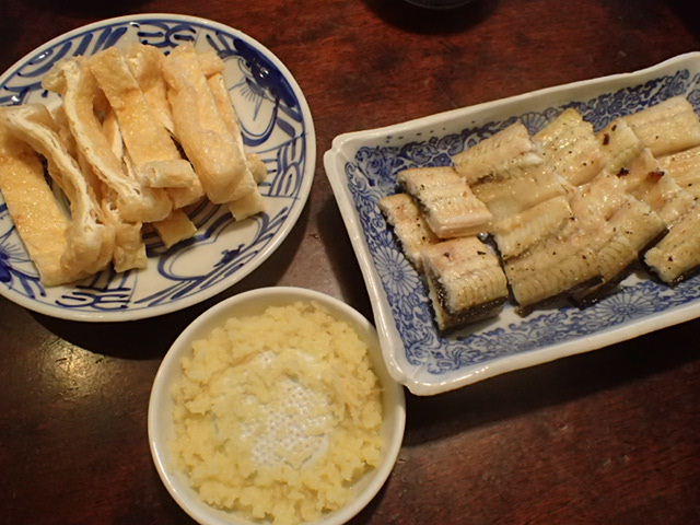 奥さんが、土用の丑用に、一色鰻の上等なのを二尾買っていた。本当は、今夜の予定だったが、昨夜、他に食べる物が無いから、食べちゃおうって事に成りました二人とも、ご飯は要らないし、良い鰻だから、白焼きをメインに、生姜と山葵を用意しました。油揚げを一緒に焼いて。明太マヨで、野菜スティックモッツァレラ入りの野菜サラダお頭近くと、尻尾側は、蒲焼風に。皮が上手に焼けていて、身厚です。それをお酒を塗ってオーブンで温めました。皮もサクサクで、身もふっくらと、美味しいです二日前に、大きな穴子が手に入り、奥さんが炊いてくれたのを、煮凝りで食べようと、冷蔵庫で冷やしておいたもの。ひんやりとした煮凝りが、旨味をたっぷり含んでいて、口の中で蕩けていくのが楽しい。奥さん、穴子の炊くのが上手に成りましたお相手は、芋焼酎、田倉鹿児島県の高良酒造さんは、八幡で有名な蔵です。田倉も、しっかりしてるけど、芋臭くなく上品で、力強いけど飲みやすい。癖が無いです。おじさんはロックで、奥さんはお湯割り。どちらも美味しい両刀使いです。