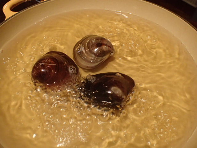 のむりえさんから、桑名の日の出さんの蛤を頂きました。鍋が大きいから、小さく見えますが、デカいです。小児手掌大です。ずっしりと重い。しゃぶしゃぶというか、特製出汁がついて来てますから、その中で、口が開くまで温まって頂きます。浅利みたいには、簡単には開かないですね。まずは、蛤だけでお汁に蛤のエキスを追加します。その方が、後から入れる豆腐屋ネギが、より美味しくなります。その間、日本酒をちびちびちと奈良県の油長酒造さんの、風の森奈良県の酒適合米、露葉風という品種から出来ています。しかも、無濾過、無加水、生酒舌の上で、かすかに弾ける感じが、酸味と共に心地よいです。甘さも有りますが、重たくない。冷やが美味いです。奥さんと四合瓶があっと言う間に空いてしまいます危険な酒です豆腐とネギも美味しいです。出汁を吸い込ませたいんで、ネギをくたくたに煮ちゃいます貝は、フランス人がなんと言おうと、日本酒だほとんど球形と思えるほど、ぷくぷくくにゅくにゅの蛤。牡蠣ののミルクと言うけど、蛤もミルクです。〆は当然コレ蛤は見えないけど、蛤雑炊海苔の香りが邪魔かな?もう、コレも飲んじゃうぞ蒸し暑い夜ですが、クーラーをガンガン効かせて、蛤鍋に冷酒週末でもないのに、罰が当たりそうだ