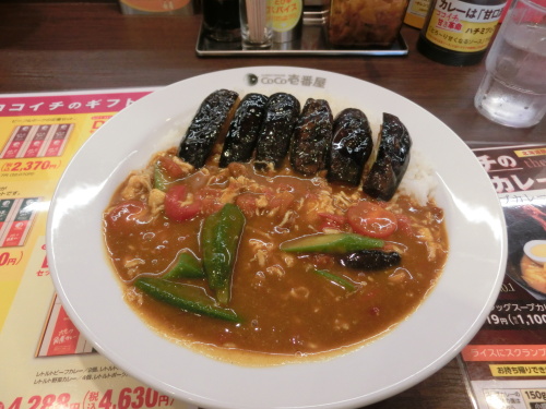 全くの身内ネタというか、楽屋落ちというか・・・チキンと夏野菜カレー+ナス 956円 nkucchanや禁玉さんみたいに辛さに強くないので、おじさんは辛さ2番にしてみた。と亮おじさんが言い・・・禁玉減酒さんが、今日のおいらは、(煮込みチキン+完熟カットトマト×2)を4辛、ライス200グラムです。との事三兄弟に成りたくて、おじさんも・・・・野菜サラダに、うで玉子とフライドチキンをトッピ。これって、親子サラダと言うんだろうか?異様に黄身が大きく見えませんか? 亮さんと同じ、チキンと夏野菜 に、スクランブルエッグのトッピコレも、親子夏野菜カレーと言えるね亮さんの2辛に対し、おじさんは4辛亮さんのルーより、赤く見えますご飯は、200gと少な目です。ルーはシングル増量 ルーを多めにすると、ご飯だけが余る心配がないから、心に余裕が生まれる暑い日に、熱い辛いカレーを食らう頭皮がジンジンして、汗が滲み出て来て、額の汗と合流して、こめかみから皺を伝わって目に染みる年寄りならでは汗をかくのって、本人は気持ちイイが、周りの人間は、きっと、気持ちワリイと思ってるな