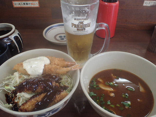 味噌かつで有名な、鶴舞公園近くの、七本松通りに在る「とん八」さんおじさんは、味噌カツ、食べない派ですが、ここ、好きなんです。とんかつを食べようと思いつつ、メンチかつに魅かれるな~~でも、結局、玉子ちゃん大王としては、エビフライ玉子とじ定食に、目を奪われるこれらのメニュウを見ると、洋食屋さんって思いませんか?ハムサラダより、マカロニサラダが50円高いのが気に成るんですが・・・エビフライ玉子とじ定食、来ました太短い、ぽてっとお汁を吸ったエビフライがよっつ。かなり醤油と砂糖の甘さが濃いです。この甘辛いお汁を吸った衣だけで、ご飯もりもりいけます胡瓜の糠漬けが、無用に大きな皿に入ってる醤油は自分でかけたいです。エビフライ玉子とじ丼に変身させます丼持って、わしわしかっこむお汁の味が濃くて、折角の海老フライの良さは消えちゃうでも、やっぱり、お汁と油の染みた衣が旨いな玉子ちゃん大王だかんねハム入りオムレツももう、腹が破れそうちょっとお値段が高いような気もするんですが、なんか、たまには行ってみたくなるお店なんです