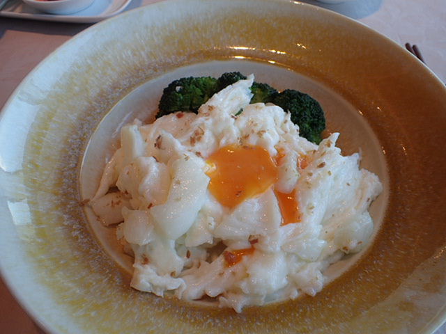 麗穂に、忘年会の最終打ち合わせに。ついでにお昼ごはん顔見知りのスタッフに、「なんか蟹玉じゃない、たまご料理ないの?」って聞いた答えがコチラ魚の白身と卵白をたっぷりの油の中で炒めた物。白身と卵白の区別がつかないくらい真っ白な料理です。それに卵黄がぽとん。ブロッコリーも糖質制限的に優秀な野菜です白身と卵白のとるんふるんとした食感にたいして、ブロッコリーのぶつぶつ感が楽しい。でも、本体は薄い塩味だけなんで、飽きます。黄身を絡めても単調な味で、予想通り。そこに、黒酢と、辛い何かを混ぜると、今まで上品な色白のお嬢さんだったのが、ガングロ(古っ)娘に早変わりおじさんには刺激的な味わいたまには、毛色の変わったおねえちゃんも面白いこのまま白いご飯にぶっかけて、どんぶりの縁に食らいついて、ガツガツかっ込みたいなでも、しませんよ、しませんとも折角の完璧な糖質制限メニュウを壊してはいけませんでも、一口位白い飯、食いたい・・・糖質中毒恐るべし