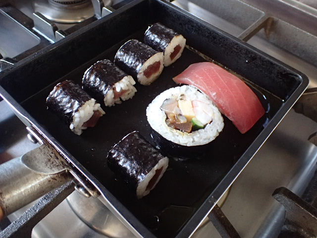 聞いてやってくれよ~、今朝よ、二日酔いの寝ぼけ眼で起きてみたら、なんだ、かかあが、「おまいさん、ゆんべ、大家さんが、どこぞの美味しいお寿司屋さんに行ったからって、おみやにお寿司を届けてもらってさ、でね、おまいさんが居なかったから、みんな食ってやろうと思ったけど、一口も食わせないんじゃ、バレた時にアレだろ、だからさ、鉄火、とっといたから、食べとくれ。」って、朝っぱらから、鉄火巻きだしやがんだよ。」何処の世界に、師走の寒みい朝っぱらから、つべたくなった寿司を食う奴が居るかってんだよ。しかもだよ、あったけえ味噌汁も無いんだよ?つべてえ寿司だけ食わせて、おまいさんにも、寿司を食わせてやったんだって、恩を着せようって算段だ、こんちきしょうだよ、そうは桑名の焼き蛤だってぇんだ、え~、見てろよ。だからよ、かかあに炭ぃ熾せって言ってやって、火鉢に網をしいてね、こう、鉄火を炙ってやるわけさ。ついでに、徳利も、灰の中に埋めてよ、ゆっくり待つって寸法さ。どうだ、つべてえ寿司が「乙」になってきたろ?おじさんは、昨夜、忘年会で居ませんでしたが、次男が東京から帰って来て、家族で寿司を出前したようです。で、かかあが、じゃなかった奥さんから、今朝、赤身が残ってるから食べてねって言われて・・・日曜日の朝から、火鉢に炭入れて、一本つけて、炙った寿司を食うのも、「おつ」ですが、残念ながら、九時から仕事の身フライパンに、油を敷いて、寿司を焼くんです。まさかと思うでしょ?これがいけんですよ、だんな海苔が焼けて香ばしくてね、酢飯の焦げたんもイイ香なんです女郎屋で、一晩過ごすじゃないですか、で、朝、目ぇさますてっと、やりて婆が火ぃ熾した火鉢を持って来てくれるわけ。そうすっと、はだけた寝間に真っ赤な半纏羽織った色がね、火鉢で、ゆんべの食べ残しの寿司を炙ってくれるんですよ。頃合いに、燗酒と焼けた寿司をお盆に乗せて、また、布団に潜り込んできやがるんだ。焼けた鉄火食いながら、おれっちも、酒で肌が鉄火に成った女に巻かれちまうって算段よ