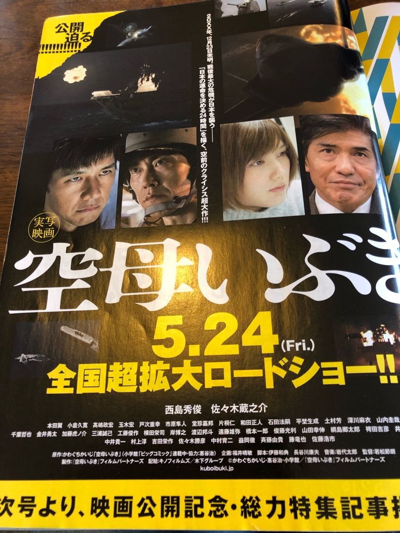 佐藤浩市さんの発言が、なんかネットで話題になっていたそうですが、映画を見る限り、全然普通の演技で、安倍首相を揶揄してると感じられるシーンは有りませんでした。前宣伝の企画もんだったの❓映画の前に、魚魚丸でハイボールを飲みながら寿司を食べるのが、小市民のおじさんの贅沢。ほらほら、隣の席の、定年独居老人が、映画のチケットを店員に見せて、味噌汁を無料で飲もうとしてるわよ。せこいわね~~~セコないわ映画だって、シニア割引で見て、何がイカンだおまんた~みたいな平和ぼけオバサンが、昼間っから回転寿司食って、長話出来るのは、わしたちが敗戦後、血のにじむ苦労を重ね、日本経済を支えてきたからだわ。その苦労も知らんと、「せこいだと~~?」・・・わなわな一回、空母いぶきに載せてもらって、自衛隊さんの覚悟を見て来い・・・もう、映画の世界に感情移入してるおじさんですハイボールには唐揚げ。ゲソの唐揚げはお得なんです。ハイボールお代わりくださいな~~~穴子の一本揚げも合います。酢飯もタレも無しで、塩で食べます。衣が厚いので、少し剥がして食べる。いつもの三種盛り。新しい定番に成りそうな、豪華海鮮盛。これは、冷酒でもいけそうです。はい、ご馳走様でした。ご飯は半分残し、蛋白質の補給できて、酒飲めて、しあわせな昼ごはんでした。さっ、空母いぶきを観ましょう予習をしっかりしたおじさんには、ちょっと欲求不満な映画でした。なんか色んな方面に配慮して、リアリティーが無くなっちゃって、大事な原作の問題定義が薄まってしまいました。芸術家かどうかは知らんけど、こういうもんを作る人達は、国家体制に気を使って物を作っては、アカンと思うんだけどな~~国の意向に沿った絵を描き、歌を作り、小説を書き、映画を作る・・・いつか来た道を歩かんようにするのが、芸術家の気概だと思うんじゃがのう~~