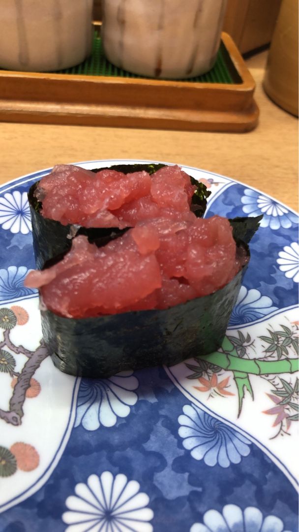 お昼を食べ損なったまま名古屋へ 金山駅の近くにある、回転寿司屋さん。 間口が狭くわかりにくいです。 前回、こじんまりとしてるけど、なかなか本格的な寿司ネタが有って良かったので、小腹を満たしに入りました。 大好きな玉子と、〆鯖を頼んだら、まあ、普通の玉子と、真っ白に〆殺された酸っぱい鯖でした。 気を取り直して、鮪の中落ちを頼む。 う〜ん、三者連続三振。 前回の、良い感じは何処に行ったの? まあ、生ビールと、3皿で、1100円なら仕方ないのかな?