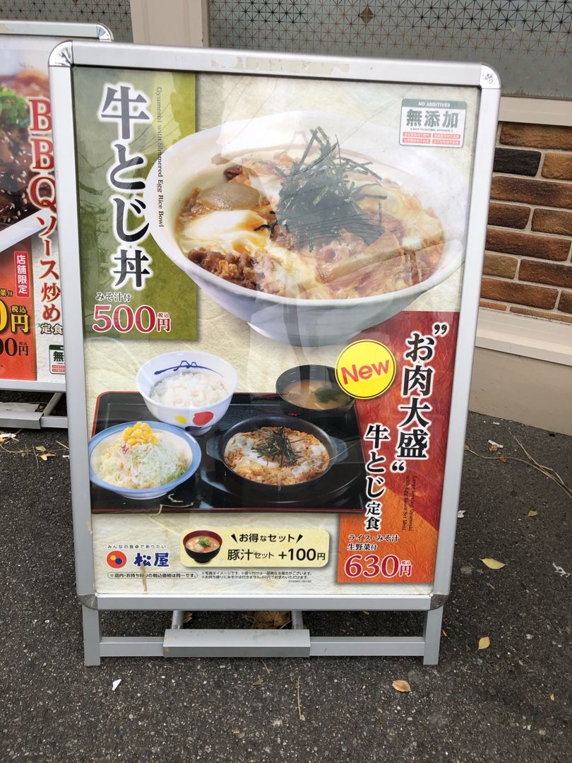 牛とじの幟につられてパーキングへ。お肉大盛りも在るぞ、イイじゃないか。これにも惹かれたが、玉子とじには敵わない。チケットを渡す時に、ご飯を小盛でお願いします。と伝えたら・・・なんと30円引いてくれた!そんなつもりじゃないのに、ありがとうございました。お礼に?半熟卵を追加しました。全然肉が大盛りに見えんのは、おじさんだけ?これで大盛りですか?間違えてませんか?と聞きたかったが、ご飯30円返してくれたから、申し訳なくて、よ~聞かん。これなら、大盛りの大盛りが頼みたいよ~とりあえず、丼に移動して・・・アッ、七味の蓋が取れちゃったバージョンにして、わしわしかっ込む。半熟玉子が無かったら、おかずが足らんとこでした。う~~~~~~ん、肉が物足らん!!豚汁が具沢山で、ちんちんで旨かったです。