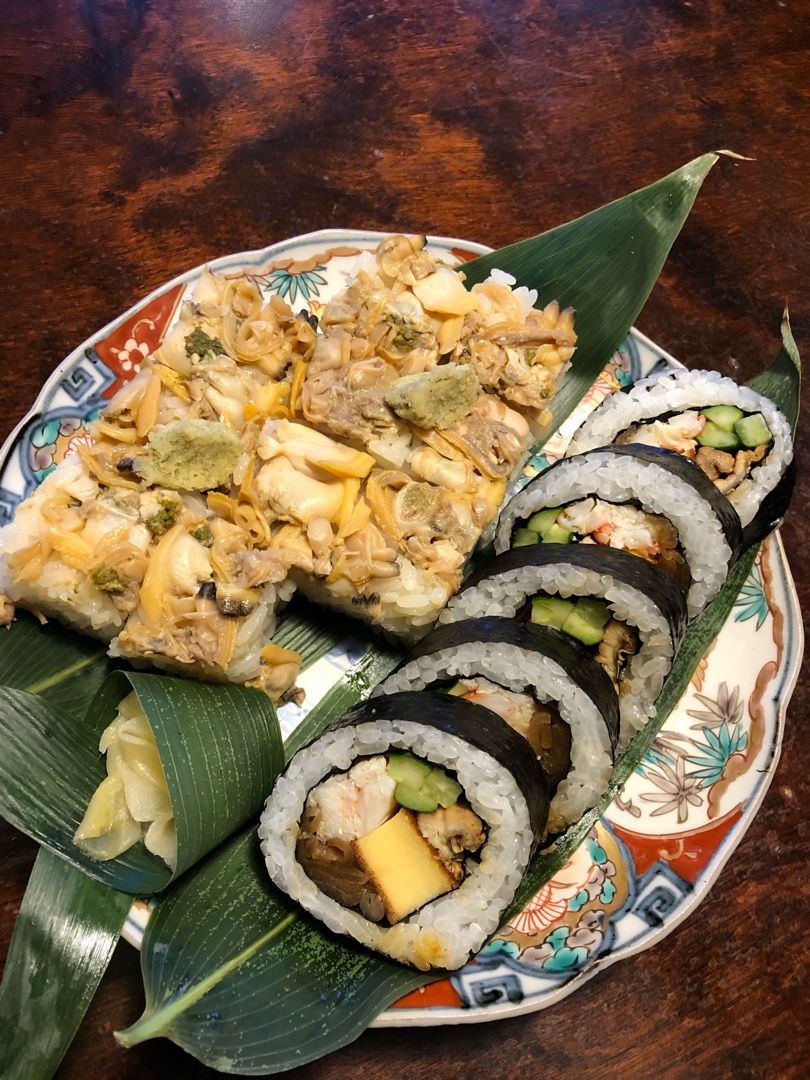 太巻きシリーズを始めようかな~外食でお寿司を食べることが減って、お持ち帰りが増えた。お持ち帰りの文化は、お寿司屋さんには元もと在ったもんね。浅利の押し寿司は、この時期だからね、いいよね、春らしいお寿司だ。当然の燗酒です。このまま、真夏も燗酒にしようかな。おじさん、スルメも好きなんです。煮浅利に山葵、乙だね。干瓢も好きだな。