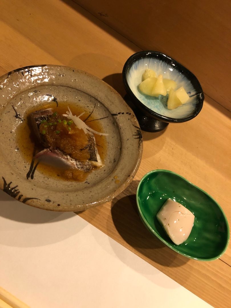 愛知県、制限が少し緩くなりました。おじさんた~夫婦も、三密を避けながら、一か月半ぶりの夕食を、知多半島の先まで名鉄電車に乗って行ってきました。イサキの白子とたたき。ビールを飲み乾したら、早速、紀土の熱燗。三河のワタリガニカウンターに二人連れが、一席分空間を空けながら三組のみ。新生姜、早くもお代わり、しょりしょり旨し。稚鮎ちゃん、おっ、変に苦くなくて乙です。ねっとりボタン海老く~~~、日本酒が・・・一合では足りません、二合徳利でお願いします。ここから握りスタート雲丹巻き小鯛って、品種?薄ピンク色の身が綺麗な鯵アイラブスミイカ三河のアカイカは血が薄いとろ~り熱々穴子〆は海苔巻きねいや~、久しぶりの外食、ゆっくり出来ました~ほろ酔い気分で幸せです~~~