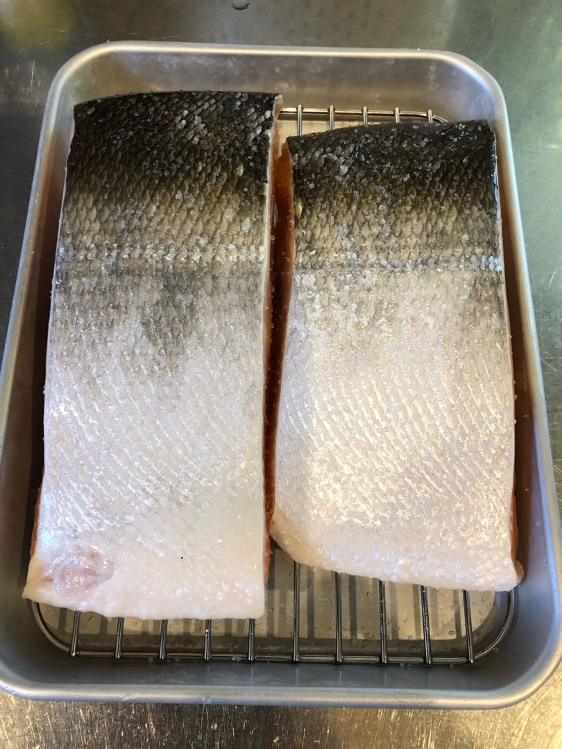 お孫ちゃんがイクラと鮭のご飯が食べたいとリクエスト。一年前に購入した時知らずを解凍。これは、釧路の北匠でなく、知床の方の業者さんですが、冷凍真空パックの保存技術が凄くて、一年経っても冷凍焼けが全くありません。塩を振ってしばらく置いて、オーブンで焼くその間に薬味の用意。勿論、キッチンドリンカーです。数分水に晒して、アクを取りましょう。この薬味入れ、おじさんのお気に入り有次で買った、篩い(ふるい)です。おじさんは塩振りにしようと購入しましたが使いこなせず、薬味入れに。皮目をこんがり焼いて完成身をほぐして炊きたてご飯に混ぜます。薬味を散らしてたっぷりイクラを乗せれば、はい、召し上がれ皮をまあ一回、高温で炙ってから刻んで乗せても旨い。大根おろしも合います。季節感が全くないけど、一応時知らずのシーズンに成りましたから。