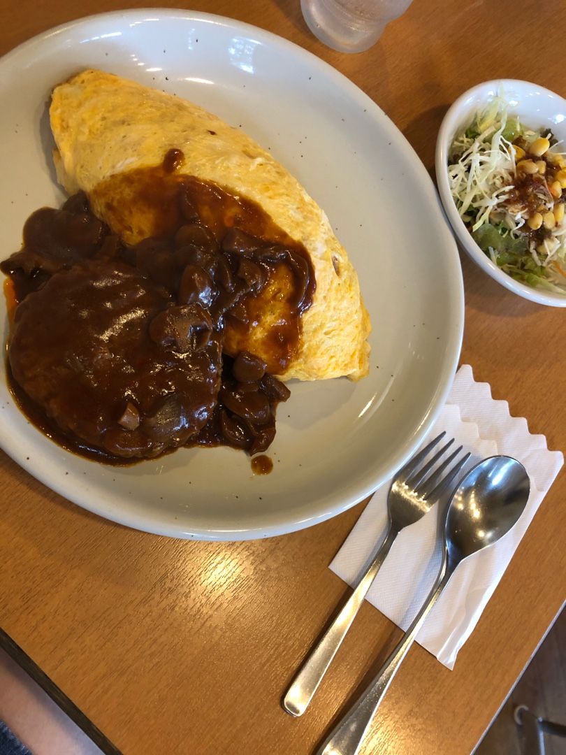 ハンバーグオムライス・・・子供の食べもんだね。エビフライ、ハンバーグ、コーラ、赤いウインナー、私は、好きなもんしか食わない子供が嫌いだ!!って歌が、昔ありました。良い時代だったな~、冗談が通じる時代で。全く関係ありませんが、これは↑正面にハンバーグを前にした置き方ですが・・・オムライスの置き方って、皆さん、どう置きますか?横向き?縦置き?おじさん、今まで、この↑ように横置きでした。でも、縦じゃイカンのだろうか?と。真っすぐ縦置き。胸に、細く尖ったほうが刺さる置き方ね。そうすると、最初のひと口目のスプーンは何処をほじるのが正解でしょうか?横置きの時は、どちらかの端っこから切り離して食べてたと思うんですが、縦置きだと、正々堂々と一番太い真ん中から攻めていく。なんか、この方が、男らしい食い方のような気がするな。子どもみたいな、「なに、クダラン事を言ってんだ!!」って、コメントは受け付けないからね。おじさんは、子供は大嫌いですから。