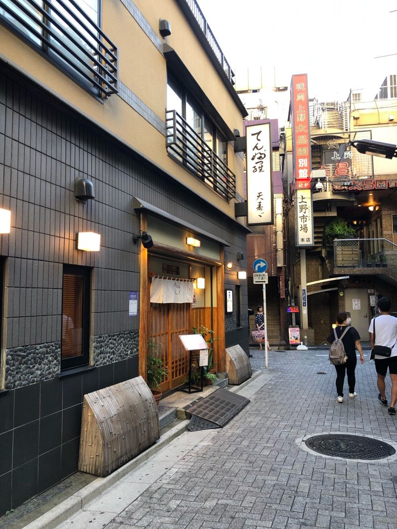 ぽんたさんで、トンカツを肴にビールは小瓶を二本で止めて、ご飯は次のお店と決めていました。江戸の黒い天つゆのかかった天丼が食べたくて、こちらへ。下町の路地に昔からある、雰囲気たっぷりの天ぷら屋さん。外に在るメニュウを見たら、天丼はお昼だけでした。残念・・・でも、コースの天ぷらが夜でも10ラーだったんで暖簾をくぐりました。カウンターに先客がどなたもいらっしゃいません。恰幅の良い、マスク越しに強面風のご主人が、センターへ手招きしてくれました。き、緊張の夏です。ハイボールを注文。カウンターの中には、天ぷら用の鍋が三台あり、流行っているお店のようです。車エビ二本から、キス天。しっかりとした衣の付け方ですね。驚いたのは、胡麻の香りが強くないんです。ご主人にお話ししたら、ちゃんとごま油100パーセントですよ。覗いてみますか?とカウンターの中の鍋をのぞかせてくれました。優しいご主人で良かった~そうしたら、天麩羅の鍋の中は真っ黒の油でビックリ。本当に良いごま油は、そんなにクドイ香りはしませんよ。と。琵琶湖の小鮎と小タマネギ。ペコロスって言う奴かな?幸寿司本店の五分の一くらいの小っささで、既に子持ちでした。ワタが苦いです。甘さが少ない。おじさんは、鮎は、やっぱり幸寿司本店だな。イカと茄子。身厚のイカです。何イカだろう?小茄子はとろとろで火傷しそう。穴子。身厚で大きな穴子の頭側が斜めに切って出てきました。細くなっているから、尻尾の方かと、見た時はガッカリしたんですが、食べたら違ってました。失礼なおじさんでした。全然、穴子臭くなくて良い香りです。美味しかったな~ご主人が、お漬物も、自家製で、「うちのは、薄味ですから、ほんの少し醤油を垂らしていただいてもおいしいですから、試してください。」と、とても丁寧で親切。若い衆が、奥から野菜を持って出てきて、網籠に茄子とタマネギを入れて、そのわきにアスパラの束を置いた時です。アスパラの穂の部分が、二、三本分、網籠の縁に引っかかったままでした。ご主人が、おじさんには聞こえない小さな声で二言、三言言いながら、そっとアスパラの束を籠の隣に置きなおしました。最後のかき揚げは、天丼か天茶にも出来ますが。と言われて、食べたかった天丼が叶いました。小海老のかき揚げと書いてありましたが、なかなか立派な海老です。しかも、海老だけの潔さ。おじさん、江戸の天丼は黒い濃い味の天ダレに、どっぷり漬けてから出てくるもんだと思っていましたが、ここは違いました。上野の下町なのに、上品な味付けで旨いの。ご主人が優しい人だと判ったんで、先ほどのアスパラの件を話たら、「あいつはまだ、19で入ったばかりですが、見込みがあるんで、しっかり仕込んでやれば、良い天麩羅職人になると思うんで、細かいことから教えています。」若い衆は奥に入っていて居ませんが、ご主人の話声が、今までおじさんに話していた時より、少し大きな声で話されている気がしました。良い店に来たな。