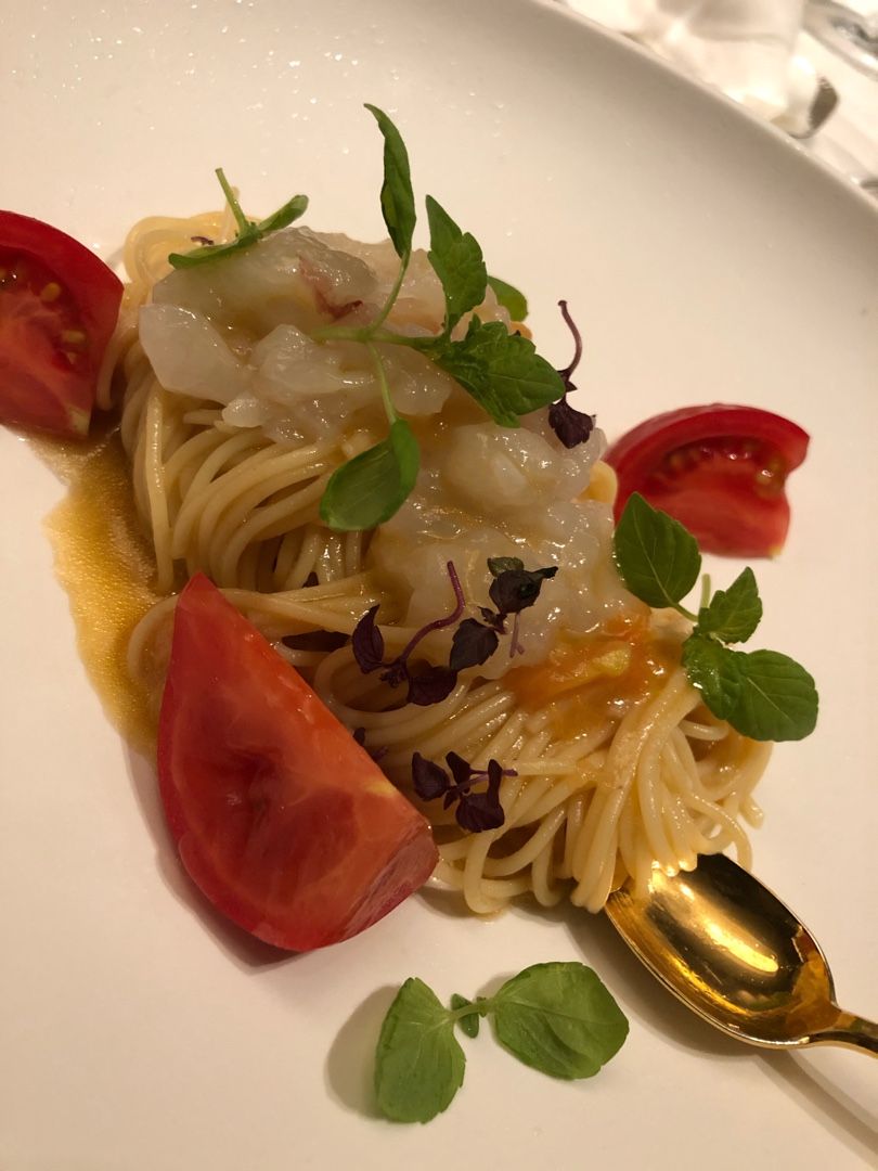 大きなボタンエビの身とトマトのカッペリーニ