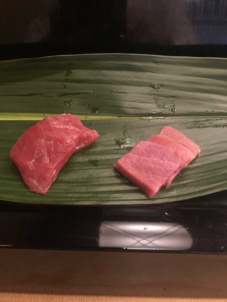 左、三日前に仕入れた赤身の芯、筋繊維の束がプリプリしてます、凄いな~。