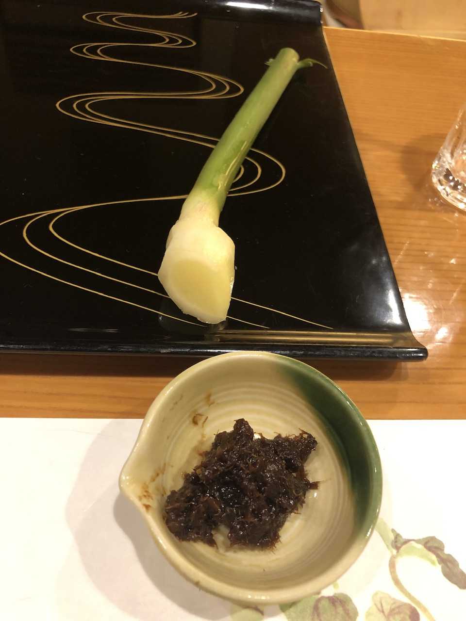 鯛味噌付けて新生姜がりがり。
