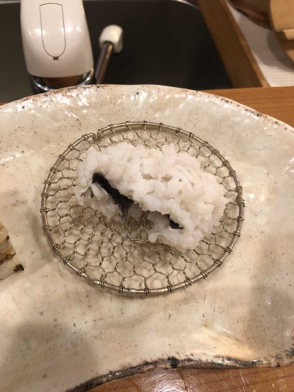 御主人が一枚づつ、網杓子に皮目を下に乗せて、出汁に沈め、身の方は出汁に浸かり過ぎないよう気をつけてしゃぶしゃぶしてくれます。