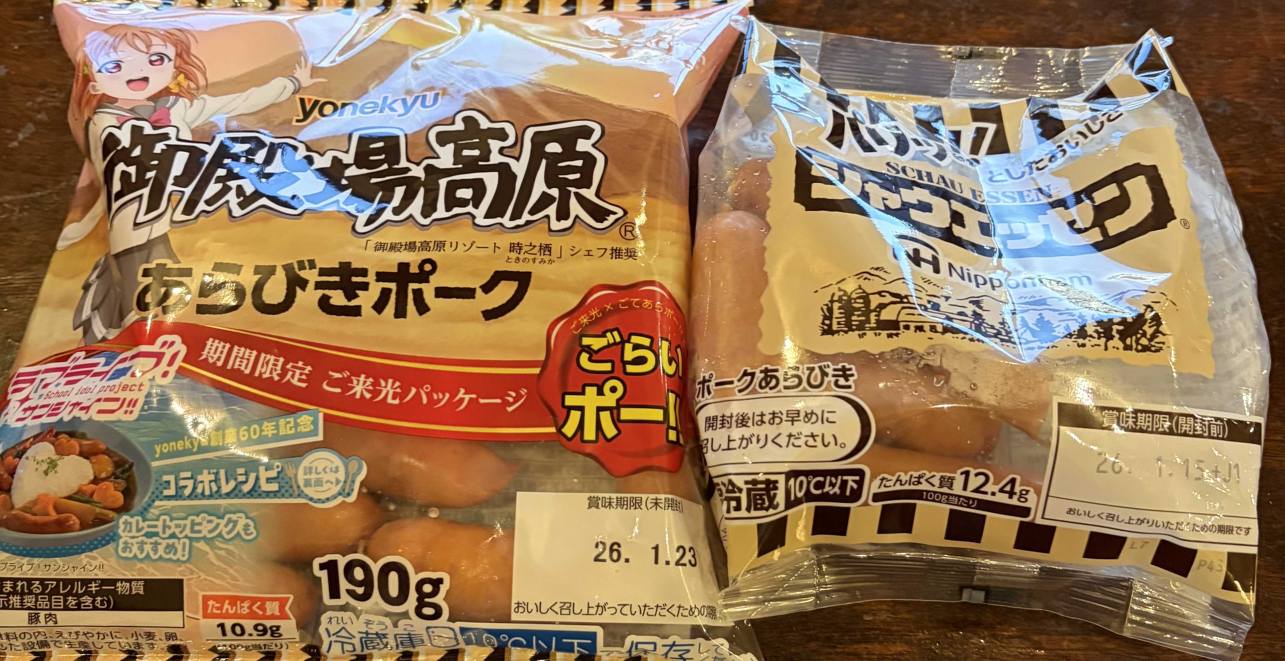 奥さんがお友達と新年会の夜、おじいさんは一人遊び。奥さんはきっと食べないものを楽しみます。ウインナーソーセージの食べ比べ。普段は、ウインナーは西尾のサンライズの赤いヤツなんですが、今回は食べ比べがしてみたかった。シャウエッセンの方が、燻煙香が強いです。この時点で、おじいさんは御殿場派に成りました。おじいさんは燻煙香が苦手なんです。若い頃はそれが好きだったんですが、年を取るにつれて苦手に成りました。茹でると香りは減りますが、齧った時のバキッと感はシャウエッセンが凄い。肉汁がほとばしる。脂肪の粒々感がよく判る。おじいさんには脂っぽい。シャウエッセンの方がマスタードに合います。それだけ個性が強いってことでしょうか。蛋白質の量は御殿場が10.9g、シャウエッセンが12.4g両方を一度に食べれば、一回分の蛋白質としてかなりの量が取れますね。ただし、これだけを二袋食べると、年寄りの胃が脂肪分でちょっと重たいです。野菜が必要です。よいとしょりは真似をしないでください。年末年始の暴飲暴食がおさまり、やっと、63キロ台の日が増えてきました。
