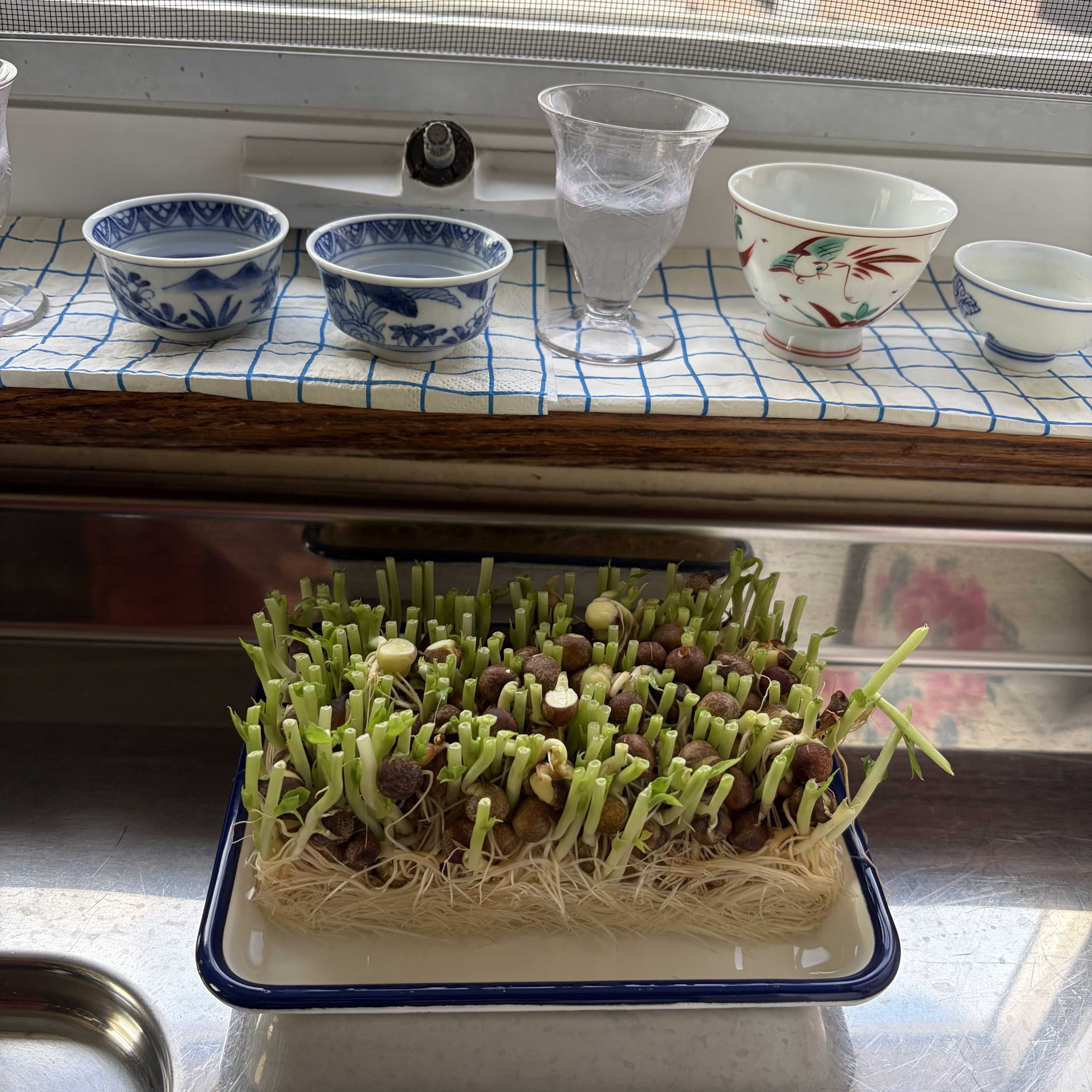 奥さんが、豆苗の再生栽培に挑戦。いつまで続くか判らないけど、まあ、やってみなはれと、おじいさんは手出しせず静観。でも、おじいさんは、一応草地学科という植物の専門学科を卒業してますから、気になる。あれ?水が少ないと思うよ。わさわさと再生し始めたら、水分の要求量は増えるから根が乾燥しないようにこまめにやりましょうね。もう収穫できますね。こんな感じで、お金に水をやるだけで増えたら楽しいだろうな~