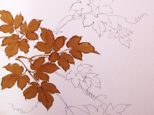 久しぶりにロー描きをする。この前に行ったのは何時だったのかさえ忘れている。図案を出して下絵を描いてローを調整して生地の前に座る。・・・描けない。・・・怖い(--;これは練習するしかない。ということで試し布で練習をする。・・・描けない。以前の描いていた感触は思い出すのだが内容が伴わない。細い線が描けない。ローによる葉の濃淡が思うようにならない・・・これでは染め上がりの調子が良くない・・・アカンっ!!!記憶の中では、バッチリ決まっているイメージがある。体の記憶もある。腕だけは動くのだが筆さばきが記憶のイメージのようにならない。オイオイ・・・自分で情けなくて笑う。筆で描いたローの濃淡だけで染まり具合の調整をする。私の仕事の中で最も高い技術と感覚の必要な部類のひとつ。もちっと練習するしかない・・・笑ってられないのだった。関連日記→ 失敗の記憶1 その2▼能登の手の日々 カテゴリー●全て ●日々 ●染色 ●能登、そして、この町 ●絵・美術について ●CG ●食べもの ▼フリーページ ・・・編集中▼リンク●ようこそNotoNote オリジナルのデザイン・あつらえの着物。染色・草木染めの専門ページです。 ▼お気に入り ブログ・その他●Water-Colour ひろろdecさん ●日々を綴る ハナママ3さん ●紅の水絵日記 M-Crimsonさん ●MoMo太郎日記 MoMo太郎009さん ●Kleine Erfrischung kamoppieさん ●考え事ほか vissel-篤胤さん ●地元力向上委員会 hanami73さん ●今日の空 つるまる5さん ●Que sera sera 五右衛門0563さん ●染工房えむ koubou-mさん ●バンブーおじさん奮闘記 幸達さん ●てんてん日記 もえぎさん★メールはこちら ★能登の手のブログへのコメントはこちら