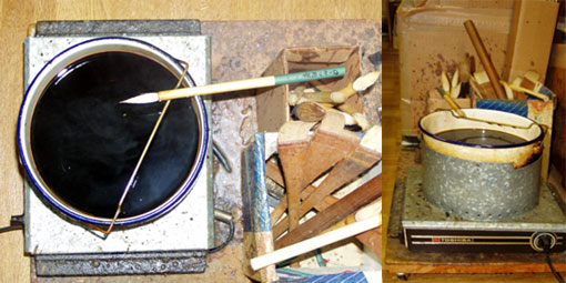 ロー描きの仕事用に新しい筆を下ろす。ローケツ染めの筆は羊の毛や鹿の毛で作られている。この筆を80度ほどの温度で溶けているローの中に入れると即、毛がチリチリになって使えなくなる。低音の状態のロー液を筆に付けて徐々に高温にして80度ほどの状態で布に描く。しかし、筆が新しいと腰が無く筆先が長すぎて使いにくい。もちろん長く使うと筆先が擦り切れて細い線が描けなくなり使えなくなるのだが、その丁度良い状態のときになるまで筆を慣らしていく。写真は電熱にかけてローが溶けた状態と筆。刷毛や使いかけの筆などがあり、キャスターをつけた台の後ろにはローが隣の生地や床に飛ばないようにダンボールでガードしてある。ローが飛んだ跡がイッパイで汚れた状態、時々ローのハネタのが指についてしまい軽い火傷を負う。ハッキリ言って、ローケツ染めは、臭くて汚くて熱い!(--;そして、なぜか私はローケツ染が大好きなのだ!(笑このローの色を見ると不思議がられることが多い。黒いローですか?と。石油から作られたパラフィンとワックスの混合で、元は白色に近く使い込んでいるうちにロー自体が熱に焼けて次第に黄色から茶色、そして黒くなる。ローの新しいうちは水をはじく力が弱く、長時間炊き込むと防染力が高まる。特に濃い色を染める場合は、こうしたローを使わないとキレイな染め上がりにならない。筆もローも新しければ良いものでもなく、古ければ良いものでもない。丁度良いところで仕事をするしかない(^^▼能登の手の日々 カテゴリー●全て ●日々 ●染色 ●能登、そして、この町 ●絵・美術について ●CG ●食べもの ▼フリーページ ・・・編集中▼リンク●ようこそNotoNote オリジナルのデザイン・あつらえの着物。染色・草木染めの専門ページです。 ▼お気に入り ブログ・その他●Water-Colour ひろろdecさん ●日々を綴る ハナママ3さん ●紅の水絵日記 M-Crimsonさん ●MoMo太郎日記 MoMo太郎009さん ●Kleine Erfrischung kamoppieさん ●考え事ほか vissel-篤胤さん ●地元力向上委員会 hanami73さん ●今日の空 つるまる5さん ●Que sera sera 五右衛門0563さん ●染工房えむ koubou-mさん ●バンブーおじさん奮闘記 幸達さん ●てんてん日記 もえぎさん★メールはこちら ★能登の手のブログへのコメントはこちら