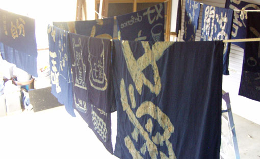 先日の藍染め書道作品が我が家のガレージを占拠している。染め布を冬空に外で干すわけにもいかず、乾いたけれどローを洗い落とす予定が付かない。日曜日から私の車はガレージの外に追いやられたままだ。そして、出かける暇も無いのでエンジンを掛けられることもなく放置されている(笑文字を書いた生徒さんたちは、出来上がりを楽しみに待っているだろうと思うのだが。この先、ローをパークレンで洗い落として文字の染め上がりの調整をして・・・全員の作品を、文字の染め上がり状態をだいたい同じような感じにしないと悲しむ人も居るから(^^ゞその後水洗いをしてアイロン掛けをして完成になるのだが、私のスケジュールの都合が付かない(^^;しか~し、なんとか年内には届けます!・・・たぶん(^^;▼能登の手の日々 カテゴリー ●全て ●日々 ●染色 ●能登、そして、この町 ●絵・美術について ●CG ●食べもの ▼能登の手の作品集(写真・CG)▼リンク ●ようこそNotoNote オリジナルのデザイン・あつらえの着物。染色・草木染めの専門ページです。 ▼お気に入り ブログ・その他●Water-Colour ひろろdecさん ●日々を綴る ハナママ3さん ●紅の水絵日記 M-Crimsonさん ●MoMo太郎日記 MoMo太郎009さん ●Kleine Erfrischung kamoppieさん ●考え事ほか vissel-篤胤さん ●地元力向上委員会 hanami73さん ●今日の空 つるまる5さん ●Que sera sera 五右衛門0563さん ●染工房えむ koubou-mさん ●バンブーおじさん奮闘記 幸達さん ●てんてん日記 もえぎさん★メールはこちら ★能登の手へのメッセージはこちら