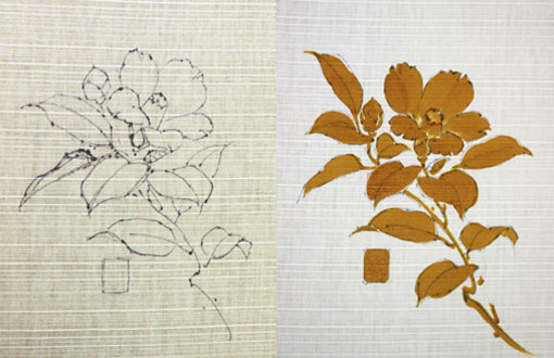木綿布に椿の花の絵を描きミニタペストリーを作る。図案をつくり木綿布に下絵を描いて(左)ローで描く(右)。ローケツ染めの模様を染めるとき普通は「ロー置き」と言うのだけど、フリーハンドの絵付け場合は「ロー描き」と表現する。椿模様を少しずつ変形して5枚描いた。手描きの場合、同じ模様を描くこともできるが、今回はセットではないので1枚ごとに大きさを変えて葉の枚数や蕾を増やしていった。5枚を染めてローを洗い落として乾燥させているところ。この後、葉脈を顔料で仕上げする。ローを使う機会が少ないので、枝などの腺を思い通りに描き上げるには気合がいる。・・・ちょっと練習しないと、ビビって腺が震えたりする(笑実は、家に誰もいないときや真夜中に集中して描くのが良い(^^ゞ▼能登の手の日々 カテゴリー ●全て●日々 ●街中ギャラリー ●染色 ●能登、そして、この町 ●絵・美術について ●CG ●食べもの ▼能登の手の作品集(写真・CG) ▼リンク ●ようこそNotoNote オリジナルのデザイン・あつらえの着物。染色・草木染めの専門ページです。 ▼お気に入り ブログ・その他 ●Water-Colour ひろろdecさん ●日々を綴る ハナママ3さん ●紅の水絵日記 M-Crimsonさん ●MoMo太郎日記 MoMo太郎009さん ●Kleine Erfrischung kamoppieさん ●考え事ほか vissel-篤胤さん ●地元力向上委員会 hanami73さん ●今日の空 つるまる5さん ●Que sera sera 五右衛門0563さん ●染工房えむ koubou-mさん ●バンブーおじさん奮闘記 幸達さん ●てんてん日記 もえぎさん★メールはこちら ★能登の手へのメッセージはこちら