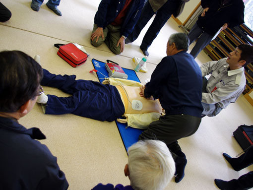 公民館でAEDの説明会があるというので出かけた。これまで人工呼吸や心臓マッサージというものを行う機会もなく、公民館にAEDが置いてあったのは知っていたが扱うことは初めて。地域から30人近くの人が集まり、担当者からの説明とビデオを観て、実際にAEDの体験。最初に人工呼吸を2回行った後、心臓マッサージ(胸骨圧迫)を30回行い、人工呼吸2回を繰り返すのだという。「心臓病の人やペースメーカーをつけている人にも行って良いのか?」と質問もしたが、なんと1台30万円以上もするという賢い機械は、心臓の状態を判断してくれるから、落ち着いて機械の指示に従えば良いのだという。・・・さて、緊急時に冷静に対応できるか?ちょっと自信はない(^^;人形で心臓マッサージを体重をかけて行ったが、「どの程度の強さ?」というのを体験してみたくて、隣にいた若い子と実際に互いの胸を押し合ってみた。「ぎゃっ!」 びっくりだ!軽く押してくれたが、非常に痛い!もちろん、意識のある人にするものではないのだが・・・(^^ゞ緊急時、救急車を呼んで病院へ到着するのに早くて40分以上も必要なこの地域。今は公民館の一台しかないが、集落ごとの集会所などに設置されていれば良いのにと思うのだが。▼能登の手の日々 カテゴリー ●全て●日々 ●街中ギャラリー ●染色 ●能登、そして、この町 ●絵・美術について ●CG ●食べもの▼能登の手の作品集(写真・CG) ▼リンク ●ようこそNotoNote オリジナルのデザイン・あつらえの着物。染色・草木染めの専門ページです。 ▼お気に入り ブログ・その他 ●Water-Colour ひろろdecさん ●日々を綴る ハナママ3さん ●紅の水絵日記 M-Crimsonさん ●MoMo太郎日記 MoMo太郎009さん ●Kleine Erfrischung kamoppieさん ●考え事ほか vissel-篤胤さん ●地元力向上委員会 hanami73さん ●今日の空 つるまる5さん ●Que sera sera 五右衛門0563さん ●染工房えむ koubou-mさん ●バンブーおじさん奮闘記 幸達さん ●てんてん日記 もえぎさん染色の専門サイト★能登の手へのメール ★能登の手へのメッセージはこちら