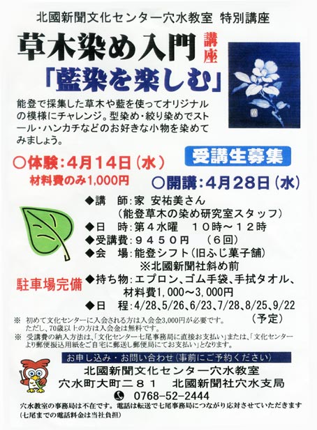工房のスタッフによる草木染めの入門講座:【藍染めを楽しむ】が始まります。体験教室は4月14日(水)午前10時~12時。北國新聞文化センター穴水教室 講座案内4月~9月の第四水曜日の午前10時~12時。全6回。木綿のハンカチやタペストリー、45×150cmの絹ストールを藍染めで、手絞り、板締め絞りや帽子絞り、型染め、生葉染め、草木染めの染め重ね等を楽しんでもらえます。藍染めで、表現できることはイッパイあります。草木染めの入門講座ですが、経験者や新たな作品を染めたい人にも楽しんでもらえる内容になります。講座への質問は能登の手もお答えします(^^▼能登の手の日々 カテゴリー ●全て●日々 ●街中ギャラリー ●染色 ●能登、そして、この町 ●絵・美術について ●CG ●食べもの▼能登の手の作品集(写真・CG) ▼リンク ●ようこそNotoNote オリジナルのデザイン・あつらえの着物。染色・草木染めの専門ページです。 ▼お気に入り ブログ・その他 ●Water-Colour ひろろdecさん ●日々を綴る ハナママ3さん ●紅の水絵日記 M-Crimsonさん ●MoMo太郎日記 MoMo太郎009さん ●Kleine Erfrischung kamoppieさん ●考え事ほか vissel-篤胤さん ●地元力向上委員会 hanami73さん ●今日の空 つるまる5さん ●Que sera sera 五右衛門0563さん ●染工房えむ koubou-mさん ●バンブーおじさん奮闘記 幸達さん ●てんてん日記 もえぎさん染色の専門サイト★能登の手へのメール ★能登の手へのメッセージはこちら