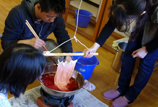 能登キリシマツツジという花がある。5月の能登の台地を見事なまでに真紅に染める花だ。「キリシマツツジを染めたら、どうなる?」と、よく言われる。あわよくば良い特産品にならないか?という狙いは私にも分かるが(^^草木染めは一般的には花や葉や根から色を煮出して、その液を布に染める。多くは20分ほど熱をかけて抽出する。キリシマツツジなどの赤い花を20分煮出すと色が出ることは出るが、色素が熱で壊れて薄くなったり鈍くなったり、加熱し続けると茶色くなったりする。そこで花びらの赤い色素をもみだして、あまり熱をかけないで染める方法もあるし、花びらを酢に漬けて色素を醗酵させて染める方法も行われている。ウチの工房でも醗酵させて染めたデータを取ったこともあり、今年もキリシマツツジのデータを取ろうとしたが、連日の雨で湿気が多くカビが早く繁殖し過ぎて諦めることになった。染色データは、必ずしも染まった結果のデータではない。染まらないデータ、失敗した結果もデータになる。が、こうして採った赤い花や紫の花や実のアントシアニンは熱に弱く汗や果汁で変色しやすく、日光に当て続けると退色しやすい。野菜や果物の色を染める工業的な方法もあるようだが一般の家庭や普通の工房では難しいようだ。また、1回染まったからといって結果を断定できないし、一回失敗したからといって無理ということもいえない。データ採りは何回でも行った結果が多いほうが良い。そして、今日も新しいデータを取るためにハンカチを4枚煮込んだ。水のPHを調べ助剤を入れたPHを計り、80度ほどの温度で20分間ハンカチを動かし続ける。この先、染まるものなのか?染まらないのか?やってみなければ分からない(^^;何故20分間、熱するのか?10分ではイケナイのか?PHは、どのくらいが一番良いのか?他のどんな方法を執れば良いのか?経験と少しばかりの理論と勘で試行錯誤するしかない。何をやっても染まらないものもある。偶然染まる場合もある。染まっても色褪せするモノもある。徒労と言えることも、やってみなければ分からない。その結果、少しでも可能性のある方法を次に繋げていくしかない。う~ん。どうする?来年、もう一度、能登キリシマツツジのデータを取ろうかね?(^^ゞ▼能登の手の日々 カテゴリー ●全て ●日々 ●街中ギャラリー ●染色 ●能登、そして、この町 ●絵・美術について ●CG ●食べもの ▼能登の手の作品集 (写真・CG) ▼リンク ●ようこそNotoNote オリジナルのデザイン・あつらえの着物。染色・草木染めの専門ページです。 ▼お気に入り ブログ・その他 ●Water-Colour ひろろdecさん ●日々を綴る ハナママ3さん ●紅の水絵日記 M-Crimsonさん ●MoMo太郎日記 MoMo太郎009さん ●Kleine Erfrischung kamoppieさん ●考え事ほか vissel-篤胤さん ●地元力向上委員会 hanami73さん ●今日の空 つるまる5さん ●Que sera sera 五右衛門0563さん ●染工房えむ koubou-mさん ●バンブーおじさん奮闘記 幸達さん ●てんてん日記 もえぎさん染色の専門サイト★能登の手へのメール ★能登の手へのメッセージはこちら
