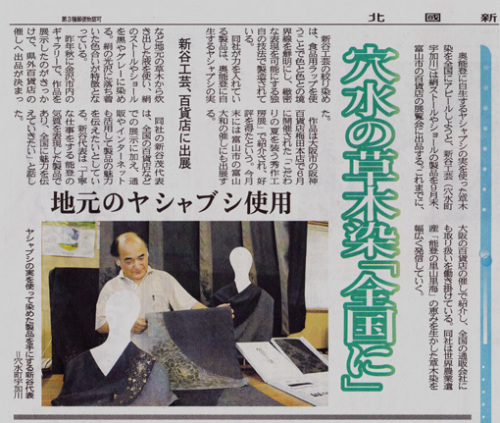 北國新聞18日朝刊に、ヤシャブシの実で染めた草木染めの記事が掲載されました。かなり以前に取材されてましたが、大きく扱ってもらえるタイミング待ちだったとのこと。感謝です。既に全国ルートで数十枚の注文を頂いており、毎日山へ行ってヤシャブシの実を採集し、乾燥させて煮出して染めているところ。左、乾燥させた実。右、生の実。自然のものは面白い。去年の実よりも今年の実がイイ色出ている♪毎日染めることによって確実に良い色の染めになっていくのが実感できる(^^▼能登の手の日々 カテゴリー ●全て ●日々 ●街中ギャラリー ●染色 ●能登、そして、この町 ●絵・美術について ●CG ●食べもの ▼能登の手の作品集 (写真・CG) ▼リンク ●ようこそNotoNote オリジナルのデザイン・あつらえの着物。染色・草木染めの専門ページです。 ▼お気に入り ブログ・その他 ●Water-Colour ひろろdecさん ●紅の水絵日記 M-Crimsonさん ●MoMo太郎日記 MoMo太郎009さん ●Kleine Erfrischung kamoppieさん ●考え事ほか vissel-篤胤さん ●地元力向上委員会 hanami73さん ●今日の空 つるまる5さん ●Que sera sera 五右衛門0563さん ●染工房えむ koubou-mさん ●バンブーおじさん奮闘記 幸達さん ●てんてん日記 もえぎさん染色の専門サイト★能登の手へのメール