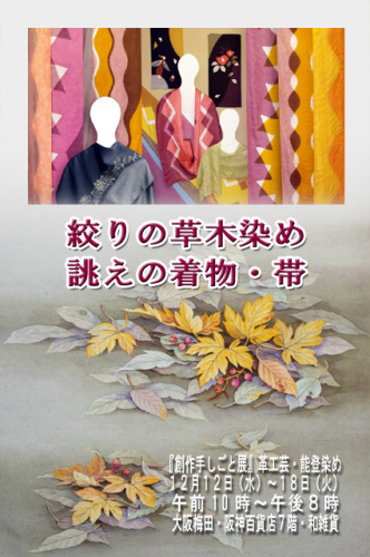 今年の始めに仕事のテーマとしては、「能登の草木染めを知ってもらう」という課題があった。見てもらう、知ってもらうが始まりだから。3月の東京・原宿展から始まり、あちこち出かけたり作品や資料を提出したりで全国向けの通販に2回採用となった。そして、最後の12月は12日から大阪梅田の阪神百貨店で今年の締めくくり。出張といえば聞こえは良いのだろうか?しかし、1週間のビジネスホテル連泊は結構厳しいものがある。この立場、誰しも口にするのが売れないときの一日のつらいこと。そんな思いも胸にしまいこんで、年末に家を空けるための準備に追われている日々。草木染めの手絞りと手描きの帯などを展示する。どちらも模様はオリジナルなのは当然のこと。草木染めの絞りはマニアックともいえるかも(^^;他のマネではない草木染めを目指した結果、染め方も絞りの技法もオリジナルで完成することが出来た。色の彩度と絞り技法によって、本当に草木染め?と疑われたりもした(笑化学染料も植物の液も、夫々の良さがあるので使い分ければよいこと。虚偽の内容を出すことは恥でしょう(^^枯葉の模様は紬の帯。コチラは化学染料を使った技法で友禅とロウケツと素描きの混合技法。どんな技法を使おうと、自分が表現したい世界を的確に染められれば良いこと。枯葉の模様は、着物の世界では『吹き寄せ』という。初雪も淡く舞って能登の平野部も初冬の嵐に吹きさらされている。家の前の坂道にも葉が舞って、コチラは『吹き寄せ』というイメージではなく、枯れ葉落ち葉の汚い『吹き溜まり』になっている(--;もう一息。能登の草木染めの絞りの魅力を広めることが、今のテーマだ。そして、来年は、もっと染めの魅力を深めていく方向が見えてきた♪能登の独自の染め、まだ始まったばかり。▼能登の手の日々 カテゴリー ●全て ●日々 ●街中ギャラリー ●染色 ●能登、そして、この町 ●絵・美術について ●CG ●食べもの ▼能登の手の作品集 (写真・CG) ▼リンク ●ようこそNotoNote オリジナルのデザイン・あつらえの着物。染色・草木染めの専門ページです。 ▼お気に入り ブログ・その他 ●Water-Colour ひろろdecさん ●紅の水絵日記 M-Crimsonさん ●MoMo太郎日記 MoMo太郎009さん ●Kleine Erfrischung kamoppieさん ●考え事ほか vissel-篤胤さん ●地元力向上委員会 hanami73さん ●今日の空 つるまる5さん ●Que sera sera 五右衛門0563さん ●染工房えむ koubou-mさん ●バンブーおじさん奮闘記 幸達さん ●てんてん日記 もえぎさん染色の専門サイト★能登の手へのメール