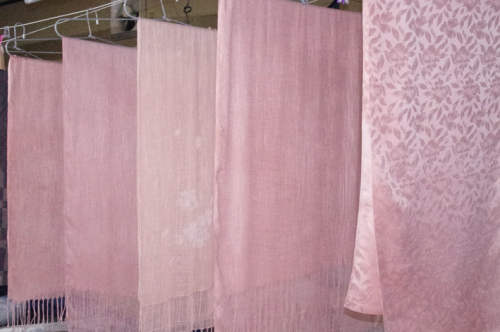 5月の下旬になって、ようやく桜染めのレポートができるようになった。4月初めから色を作り出して5月下旬で染めあげた・・・なんとも手間と時間のかかる染めだ。逆に、手間と時間をかけなければ手に入らない色。つまり、手間と時間をかけた人だけが桜色を染めることができるということかもしれない。桜染めは、一般的な染めのテキストには染色方法が載っていない。私も教科書で学んだものではない。誰かに教わったものでもない。ネットで情報を探しても、重要なところは明かされていない。失敗をして改良をして染め方を進めるのだが、「何かに気づけば」進めるようになる。・・・そういう染めも多い。むしろ、草木染めは、そういう『気づき』に進むことによって成立するのかも知れない。同じ染料で染めても地下水より水道水は染まりにくい。だが、水道水でも色を重ねることによって(手前2枚の模様)濃く染まる。これでなんとか、教室のメンバー誰が染めても桜色になりそうだ(笑今回は隣集落の八重桜、許可をもらって切ったがチェーンソーで左手の中指と薬指まで切って病院通いもした。血まみれになった枝を煮出したので紅く濃く染まったかもしれない?って・・・バカなことを(-_-;)地下水でも家によって水脈によって、鉄分が多かったり塩分が濃かったりで染め色は変わってしまう。生地や水の条件によって染め色は左右される。自然のものだから、それでよい。桜染めは、染める人の使う水によって、それぞれの人が工夫するもの、で良いのだと思う・・・ん~~~他の草木染めでも同じような気がする~ぅ(^^;▼能登の手の日々 カテゴリー ●全て ●日々 ●街中ギャラリー ●染色 ●能登、そして、この町 ●絵・美術について ●CG ●食べもの ▼能登の手の作品集 (写真・CG) ▼リンク ●ようこそNotoNote オリジナルのデザイン・あつらえの着物。染色・草木染めの専門ページです。 ▼お気に入り ブログ・その他 ●Water-Colour ひろろdecさん ●紅の水絵日記 M-Crimsonさん ●MoMo太郎日記 MoMo太郎009さん ●Kleine Erfrischung kamoppieさん ●考え事ほか vissel-篤胤さん ●地元力向上委員会 hanami73さん ●今日の空 つるまる5さん ●Que sera sera 五右衛門0563さん ●染工房えむ koubou-mさん ●バンブーおじさん奮闘記 幸達さん ●てんてん日記 もえぎさん染色の専門サイト★能登の手へのメール