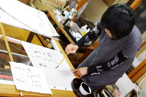 かねてより御予約いただいていた書家AOさんの草木染め布への書。本日、実現。布の上に文字を書くのは、紙の上に書くのと違って生地ごとに浸透性の違いがが大きく影響する。早い話、布の浸透性が悪いと思うような文字にならない。で、白生地に書いて感触を確かめてもらう。こんな感じ。下からガスコンロで加熱して、思うような具合に乾燥させる。そして、本番!市松模様の上に書す!コガネバナとアカネの染め重ね。オリンピック仕様?の変わり市松模様。普段の紙に書いている時とは違う体勢であっただろうに、さすがに落ち着いた姿勢。この筆の持つ高さは真似が出来ないわ(^^;他には、桜染めのバンダナと紙布のストールに書いた。こういうの書けたら良いね。私も書きたいものがあるのだけど、ちょっと勉強不足で実行できない・・・。なんとか次の機会には実現したい・・・って、そのまえに市松の染め布を準備ね!(^^▼能登の手の日々 カテゴリー ●全て ●日々 ●街中ギャラリー ●染色 ●能登、そして、この町 ●絵・美術について ●CG ●食べもの ▼能登の手の作品集 (写真・CG) ▼リンク ●ようこそNotoNote オリジナルのデザイン・あつらえの着物。染色・草木染めの専門ページです。 ▼お気に入り ブログ・その他 ●Water-Colour ひろろdecさん ●紅の水絵日記 M-Crimsonさん ●MoMo太郎日記 MoMo太郎009さん ●Kleine Erfrischung kamoppieさん ●考え事ほか vissel-篤胤さん ●地元力向上委員会 hanami73さん ●今日の空 つるまる5さん ●Que sera sera 五右衛門0563さん ●染工房えむ koubou-mさん ●バンブーおじさん奮闘記 幸達さん ●てんてん日記 もえぎさん染色の専門サイト★能登の手へのメール