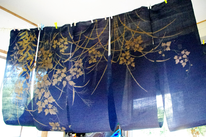 能登上布の暖簾に夏秋草模様をロウケツで手描きして藍で染めた。最近の私の労力の低下は著しくて、昨日だけで藍染めが終わる予定が今日の午後までの時間を費やしてしまった~。藍染めに手描きでロウの模様を描くのは難しいことでは無い。藍染めも夏の水仕事で良い。しかし、こうした五枚暖簾を染めると『はきあわせ』という隣同士の色の濃度や色相が同じにならなくて困ることが起きる。これを同じような色に染めるのが、暖簾の藍染めということになる。模様のロウを折ったり割ったりして亀裂を入れるロウケツ染めもあるが、この模様はロウを痛めないように作業する。それも難儀ではある(--;今日のガレージはロープを張って染め布を吊るしている。藍染めの工房ね。最近ずっと~だわ(笑これでは分かりにくい・・・写真の上下を逆にする夏は藍染めが水仕事で良いけれど、こういう大きな仕事で高さ約180cm×横185cmくらいになると体力が必要だ。そして、大量に水を使うのでビニール合羽を着てもジーパンもTシャツも水浸しになる。ここ数日は激しい暑さで、頭がクラクラしてきた。この藍染めの仕事で以前に救急車のお世話になった(^^; なんだか、それが脳裏をよぎって慎重になったが。これから、ちょっと家の周囲の草刈が待っている。しかし、楽天ブログの管理画面が新しくなって、分かりやすいけど慣れてなくて時間がかかったわ(^^; 今日の草刈は止めようかな(笑▼能登の手の日々 カテゴリー ●全て ●日々 ●街中ギャラリー ●染色 ●能登、そして、この町 ●絵・美術について ●CG ●食べもの ▼能登の手の作品集 (写真・CG) ▼リンク ●ようこそNotoNote オリジナルのデザイン・あつらえの着物。染色・草木染めの専門ページです。 ▼お気に入り ブログ・その他 ●Water-Colour ひろろdecさん ●紅の水絵日記 M-Crimsonさん ●MoMo太郎日記 MoMo太郎009さん ●Kleine Erfrischung kamoppieさん ●考え事ほか vissel-篤胤さん ●地元力向上委員会 hanami73さん ●今日の空 つるまる5さん ●Que sera sera 五右衛門0563さん ●染工房えむ koubou-mさん ●バンブーおじさん奮闘記 幸達さん ●てんてん日記 もえぎさん染色の専門サイト★能登の手へのメール