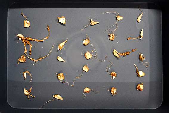 ササユリの種子に出会って2年目の春が始まった。昨年の7月からササユリの鱗片増殖を始めて400個ほど土の中に入れてきたが、10月頃からこれまでに250個程の芽が出た。まだ小さな粒のままの鱗片もあるから、それは、そのまま土の中に休んでもらっている。いつか目覚めるかもしれないと(^^昨秋10月には米粒にも満たない芽が、ちゃんと大きくなっていた♪根と芽の大きく伸びたものから、元の形のまま鱗片もあるそれぞれ違う形で芽が出ているのが不思議でもある観ているだけで嬉しくもあり、楽しい(^^色々な人の繋がりで芽の出た鱗片を10個程づつ10人に配って、手元には150個ほど育っている。昨年の秋にはプランターに植え替えたが、この春にも新たにプランターに増やしている。1年目としては上出来かな(^^今年は2年目だから、少しは自分で育てて増やす実験をしてみたい。あと3年間、自分で育てたササユリが花開く筈、毎年球根を増やして広げていきたい。ササユリも染料植物も増やす実験が楽しい♪ 若いころから草花を観察して、染めて絵を描くのが仕事だったけど。一人で6mの単管を担いで背伸びをして組むという・・・老後にこんな楽しい肉体労働が待っているとは思ってもみなかった(笑)ウルシチップが手に入らない場合・・・ウルシチップの作成と販売も行っています。先ず試し染めをしてみたい方はチップ200g送料込み1,100円で販売しています。ご希望の方はshigunaru16@gmail.comまで。染め方のプリントも同封します。チップ200gで繊維200g以上染めることが出来ます。▼能登の手の日々 カテゴリー ●全て ●日々 ●街中ギャラリー ●染色 ●能登、そして、この町 ●絵・美術について ●CG ●食べもの ▼能登の手の作品集 (写真・CG) ▼リンク ●ようこそNotoNote オリジナルのデザイン・あつらえの着物。染色・草木染めの専門ページです。 ▼お気に入り ブログ・その他 ●Water-Colour ひろろdecさん ●紅の水絵日記 M-Crimsonさん ●MoMo太郎日記 MoMo太郎009さん ●Kleine Erfrischung kamoppieさん ●考え事ほか vissel-篤胤さん ●地元力向上委員会 hanami73さん ●今日の空 つるまる5さん ●Que sera sera 五右衛門0563さん ●染工房えむ koubou-mさん ●バンブーおじさん奮闘記 幸達さん ●てんてん日記 もえぎさん染色の専門サイト★能登の手へのメール