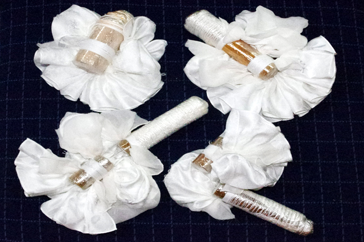 絹ストールに模様を染めるため、工房で開発した手絞り。これを観て分かる人はいるだろうか?幾つかの工夫を重ねて、更に良い方法を探している。