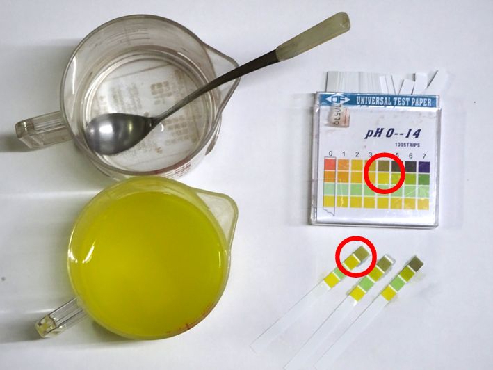 左がアルカリ水抽出で赤色味、右が酸性水抽出で黄色