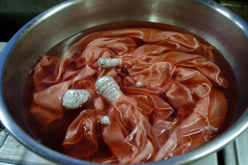 ①白生地に絞りが出来たら → 1晩水に浸す(繊維を膨張させて絞りを締め付ける)