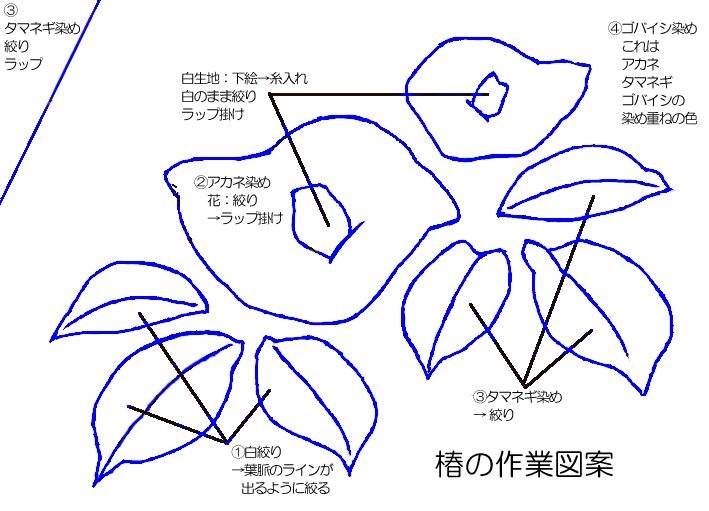 ④の部分はアカネとタマネギとゴバイシが染め重ねなので濃い地色になる