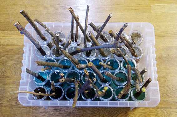 1㎝ほどの太さの枝を2か所の芽の部分を残し切って2月の初めに