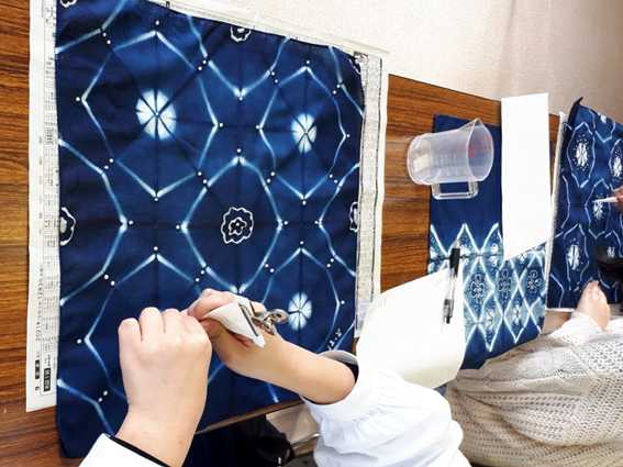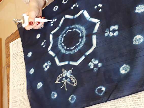 オリジナルの模様を描く藍染め教室は、こんな感じ。