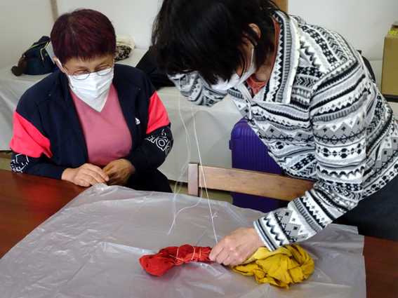 先ずはウルシ抽出液で、絹の総絞りに黄色の下地を染める